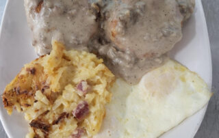 Two open faced Buttermilk Biscuits, smothered in Homemade Gravy, served with two Eggs any style and Hashbrowns